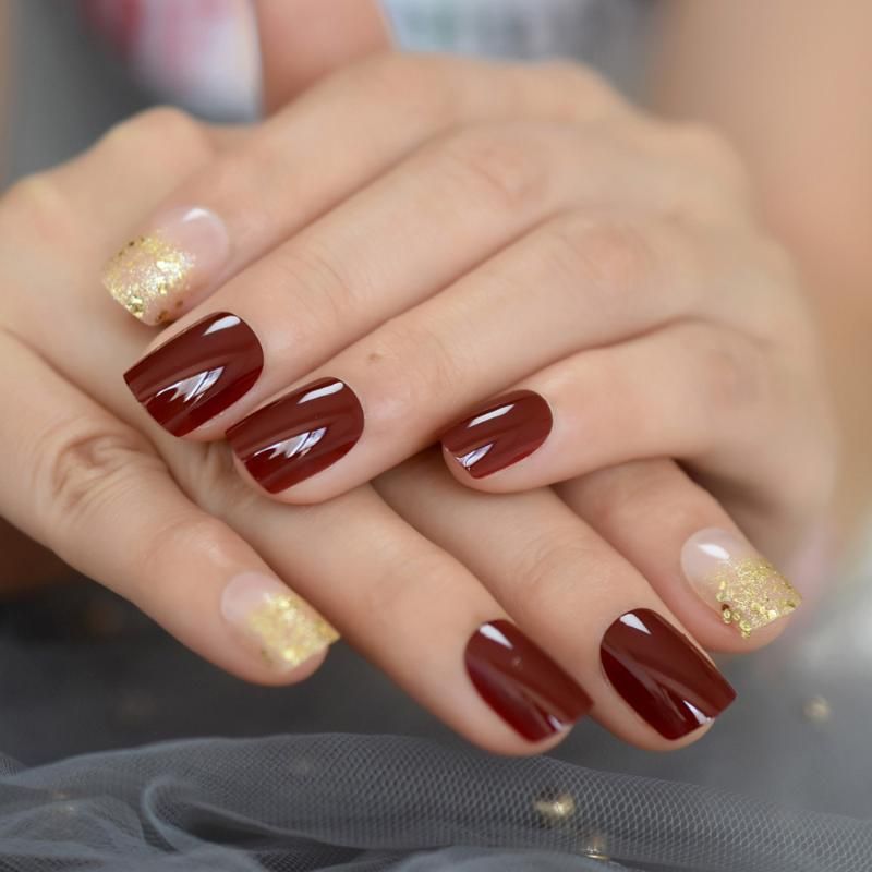 Match Glitter French Square Short Nails Sexy Dark Red Gold Powder Nude Color Fake Nails Acrylic Pre Designed Mixed Designed From Jiaogao 15 71 Dhgate Com